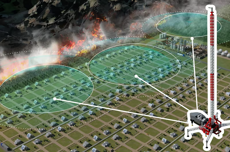 El dispositivo RainStream, creado por la empresa canadiense Wildfire Innovations Inc, se presenta como una solución innovadora para combatir incendios forestales. Este sistema consiste en una torre telescópica de acero que se transporta en un remolque integrado. Cuando no está en uso, la torre permanece en posición horizontal y acortada, lista para ser remolcada por un camión de una tonelada hasta el lugar de despliegue, como las afueras de una comunidad amenazada por un incendio forestal.