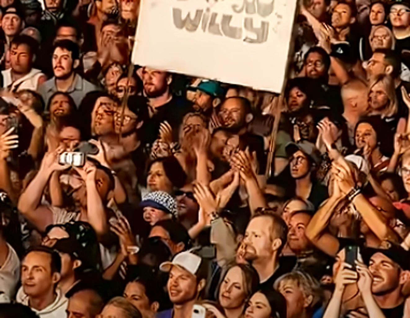 - Errores de composición: En una toma, se puede ver cómo el nudillo de un hombre se difumina junto con su cartel, que dice: «‘You Can Make It’ me ayudó a sobrevivir al cáncer. GRACIAS Will»